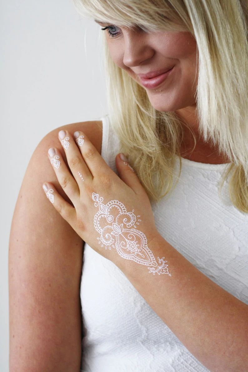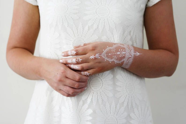 Despite what the name suggests, white henna does NOT contain any actual henna in it. Rather, it's an adhesive body paint used like henna, which lasts 1-4 days depending where you get it. The hands and the fingers especially, tend to come off much faster than other parts of the body such as the forearm and thigh. Because of this, I generally only do white henna for one day type of events like weddings, proms, or photoshoots. White henna is a cosmetic product distinct from traditional henna, lacking the natural dye lawsone found in the henna plant. Composed of body adhesive or paint, it provides a temporary and decorative alternative to traditional henna. Popular for events like weddings and festivals, it offers a way to adorn the skin with light-colored patterns, akin to temporary tattoos. While the duration of white henna designs depends on factors like skin type and care, its appeal lies in the unique and artistic possibilities it presents, diverging from the more traditional henna aesthetic.